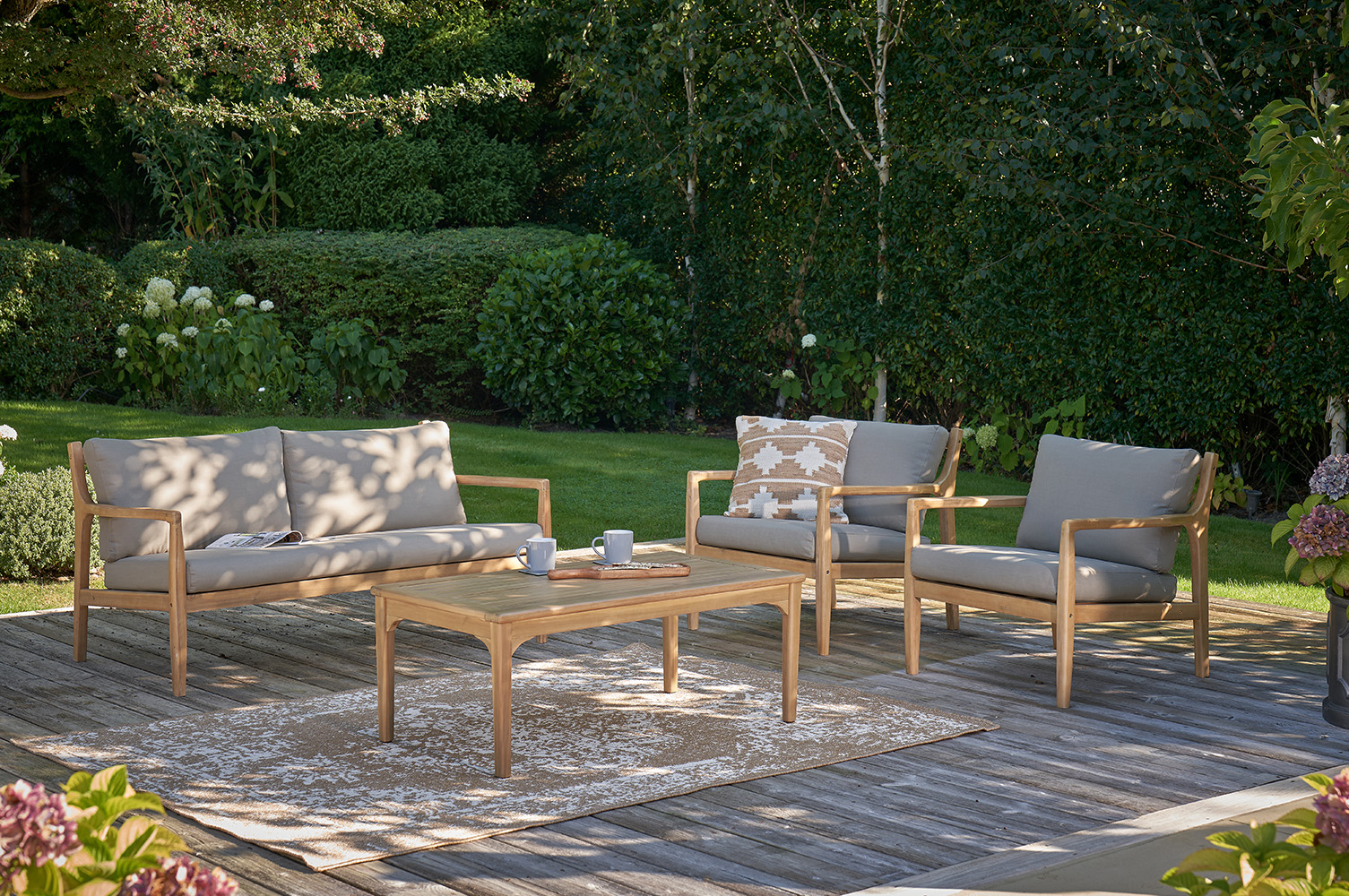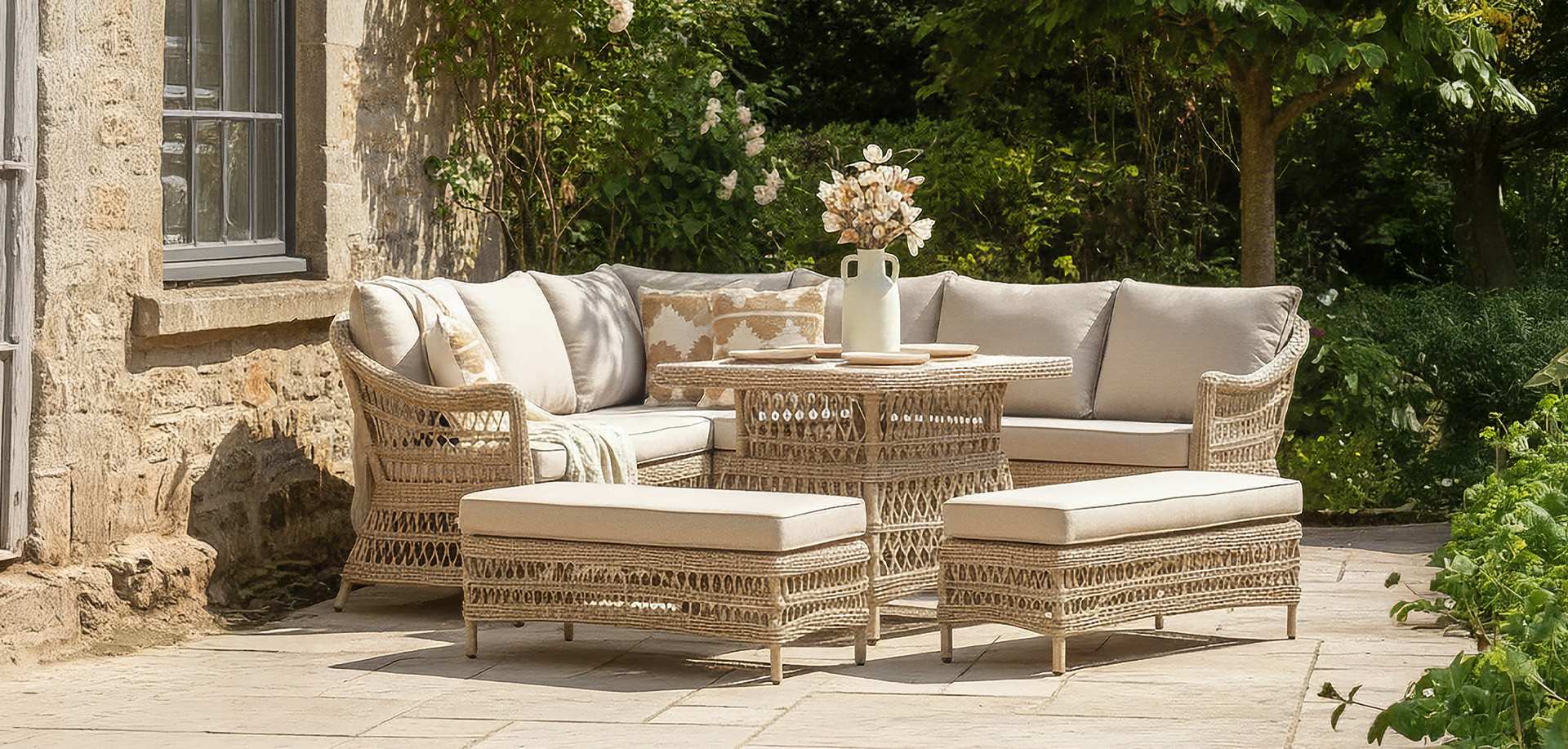 An Outdoor Seating Set is the perfect way to bring a Country Cottage style to your outdoor space. Choose an Outdoor Furniture Set like the Elba Seating Set that has a wooden frame and neutral toned cushions to encompass the natural textures and materials found in the Cottage Core style.