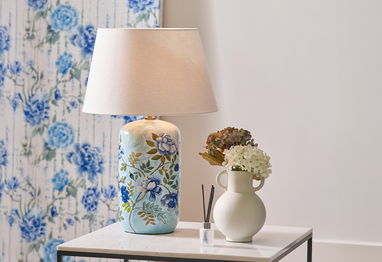 In the style of the much loved Designers Guild fabric, the Porcelaine de Chine Table Lamp features intricate paintings of trailing flowers and birds which evoke the feel of 18th Century Porcelain. This hand finished table lamp is paired with a beautiful white tapered lampshade, which enhances the stunning cobalt blue pattern.