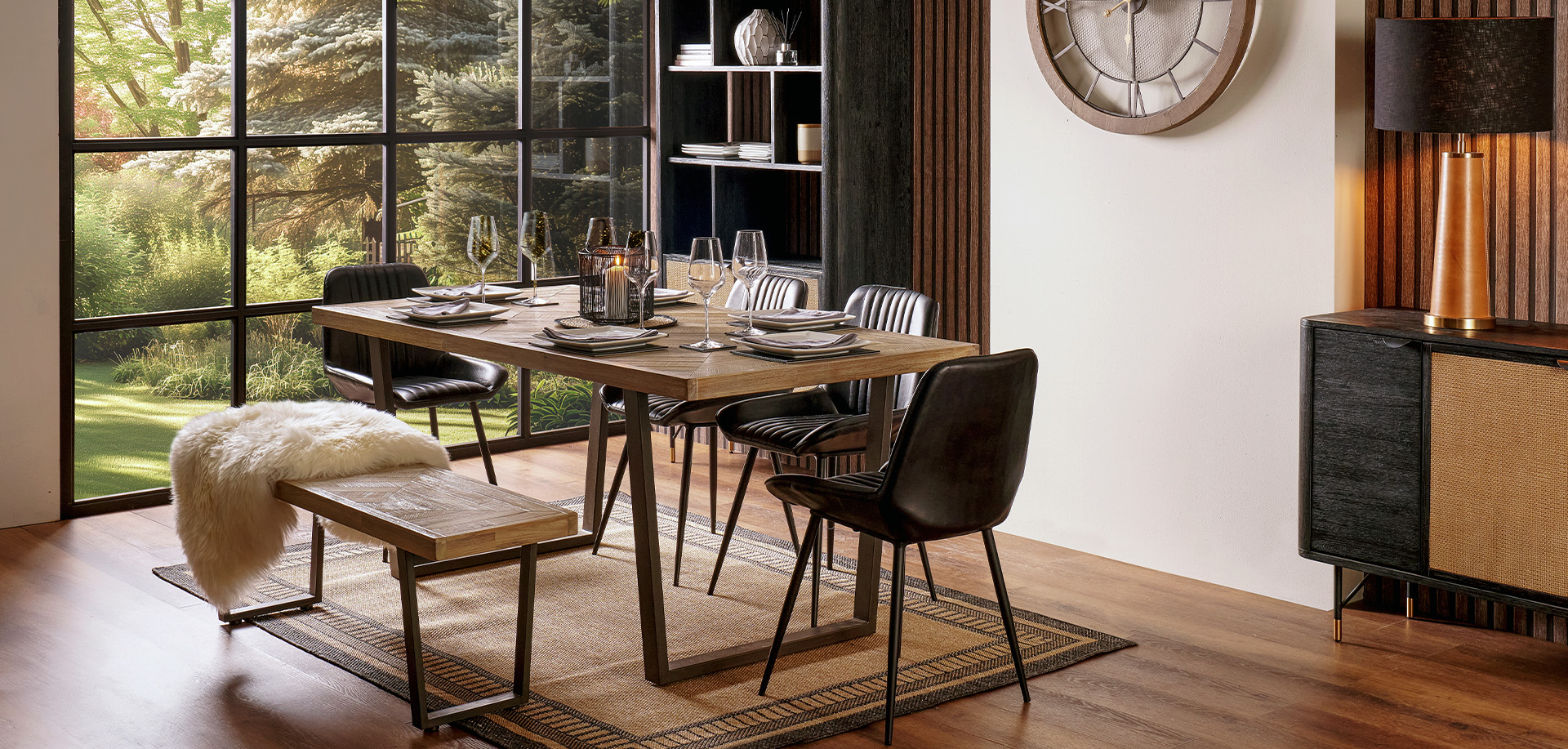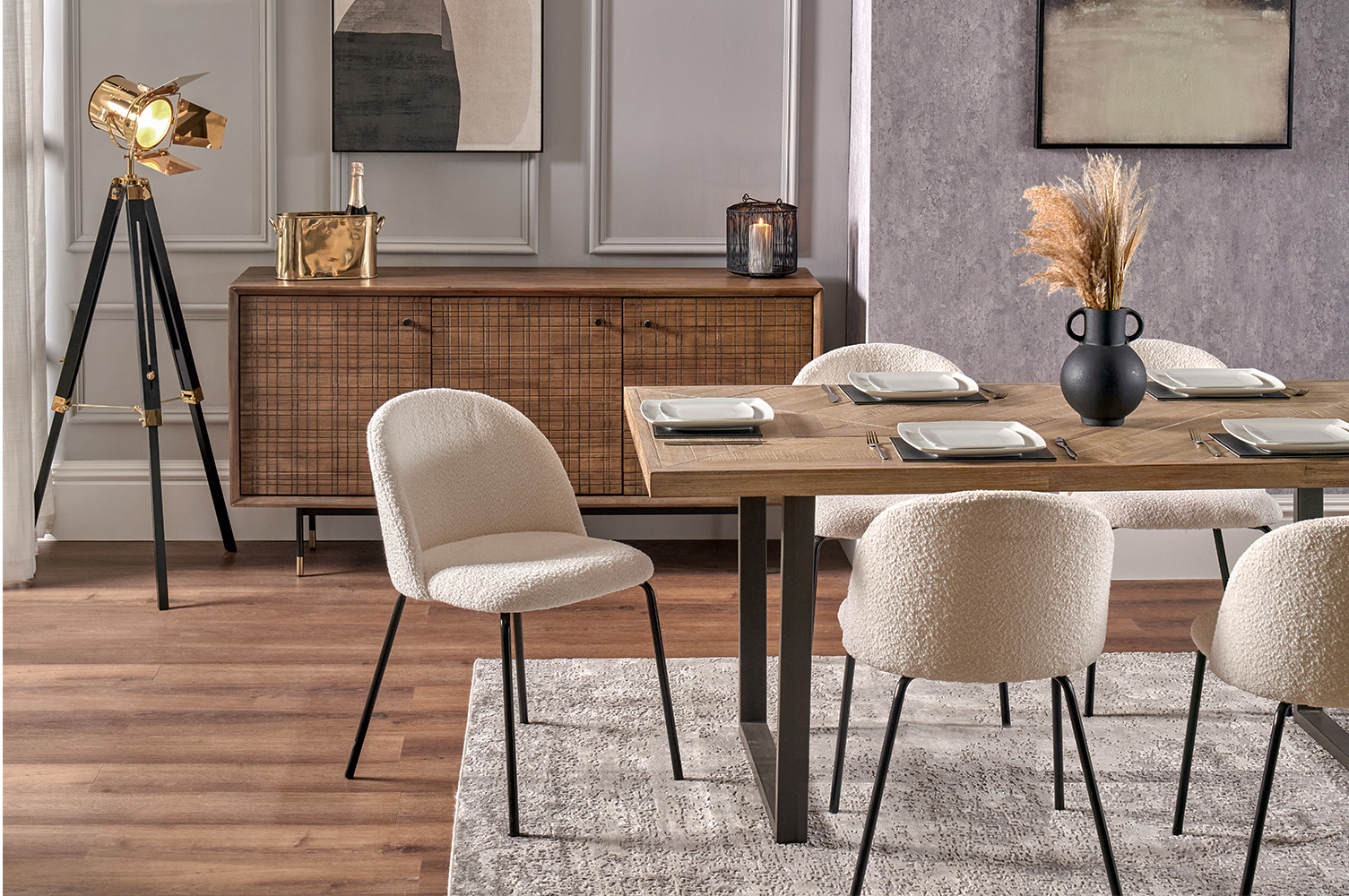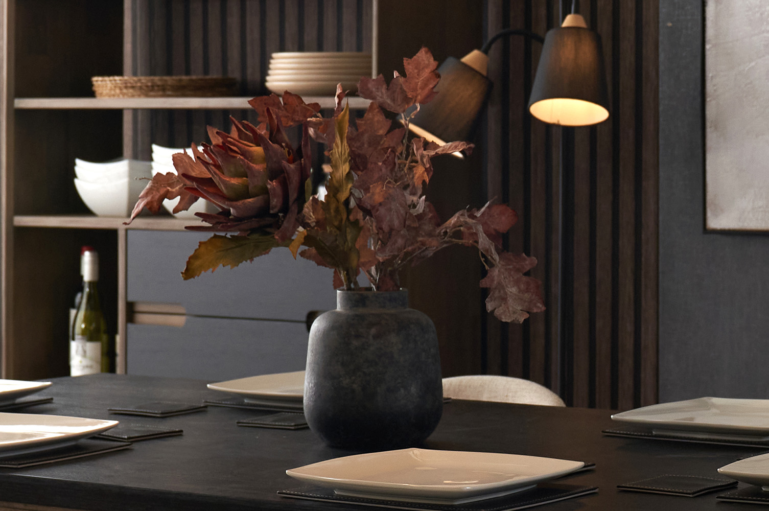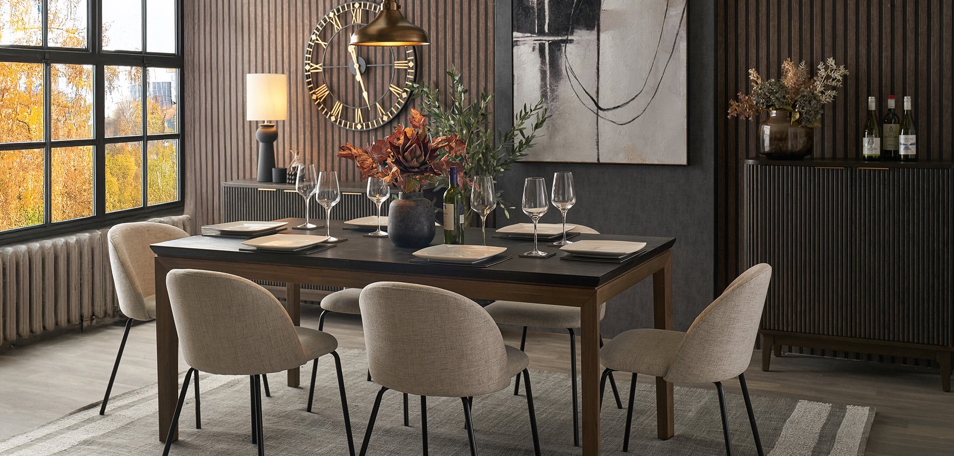 It's the little details that make a room look complete. Place a stoneware vase in the centre of your dining table, styled with seasonal faux flowers or dried arrangements. You could also place some lanterns on a nearby sideboard to add a warm, comforting glow from the candlelight.